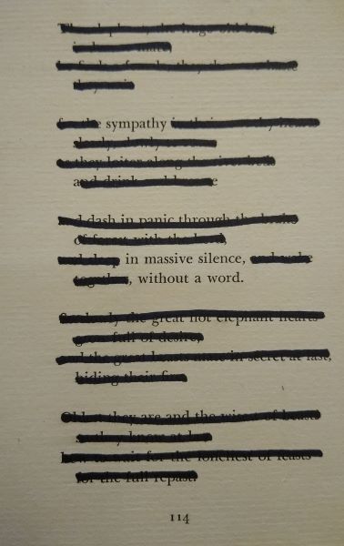 Blackout #171 Sympathy in massive silence, without a word. -Kel Dayheart Share this: Click to share on X (Opens in new window) X Click to share on Facebook (Opens in new window) Facebook Like Loading... Leave a comment Cancel reply Δ
