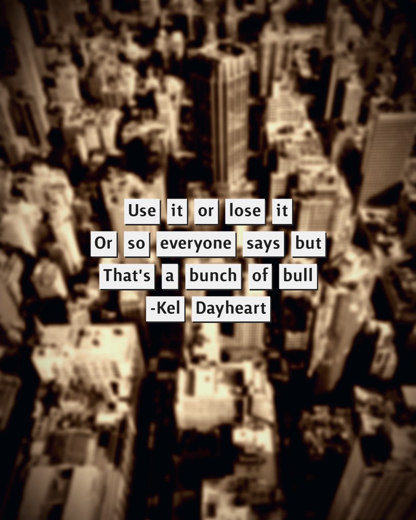 Haiku #204 Use it or lose it/ Or so everyone says but/ That’s a bunch of bull -Kel Dayheart Share this: Click to share on X (Opens in new window) X Click to share on Facebook (Opens in new window) Facebook Like Loading... Leave a comment Cancel reply Δ