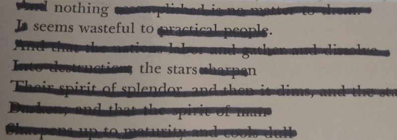 Blackout #227 Nothing seems wasteful to the stars -Kel Dayheart Share this: Click to share on X (Opens in new window) X Click to share on Facebook (Opens in new window) Facebook Like Loading... Leave a comment Cancel reply Δ